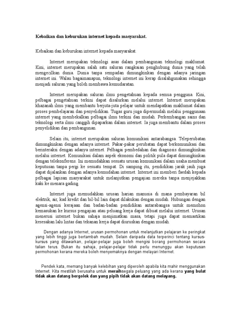 Kebaikan dan Keburukan Media Sosial dalam kalangan remaja. Peluang kepada syarikat-syarikat untuk menjual produk mereka kepada pengguna multinasional di seluruh dunia melalui internet. Contoh Karangan Argumentasi tentang Teknologi.